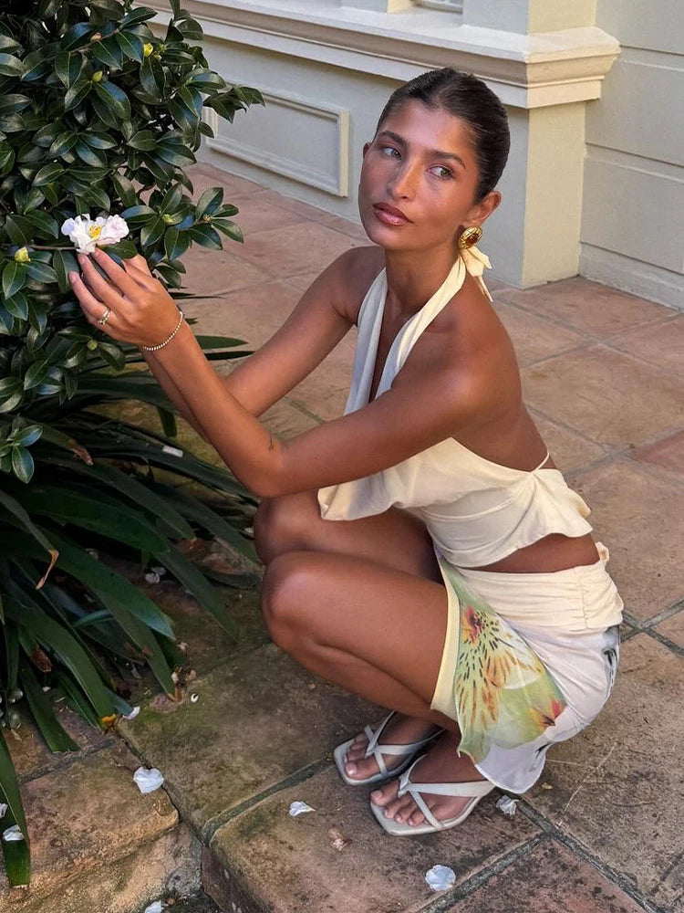 The 'Chloe' pastel yellow halterneck top and skirt two piece set.