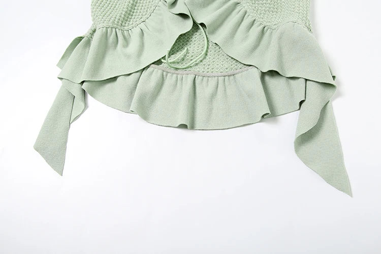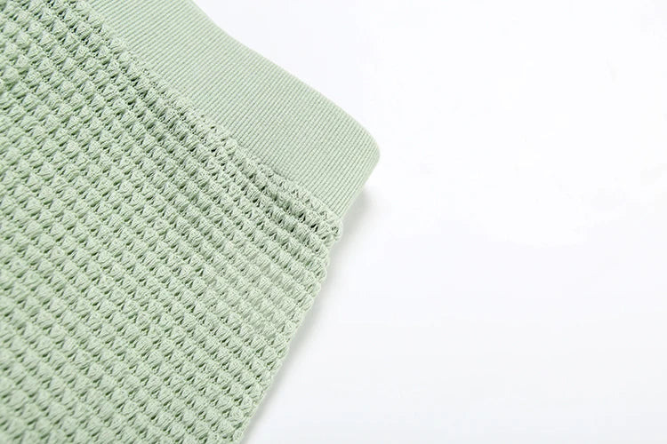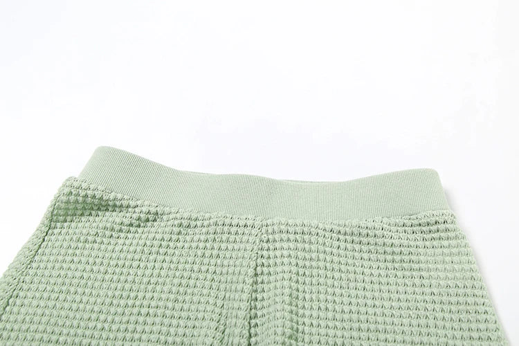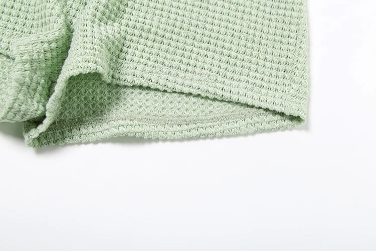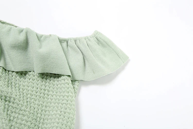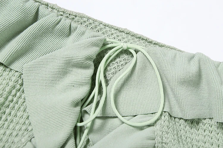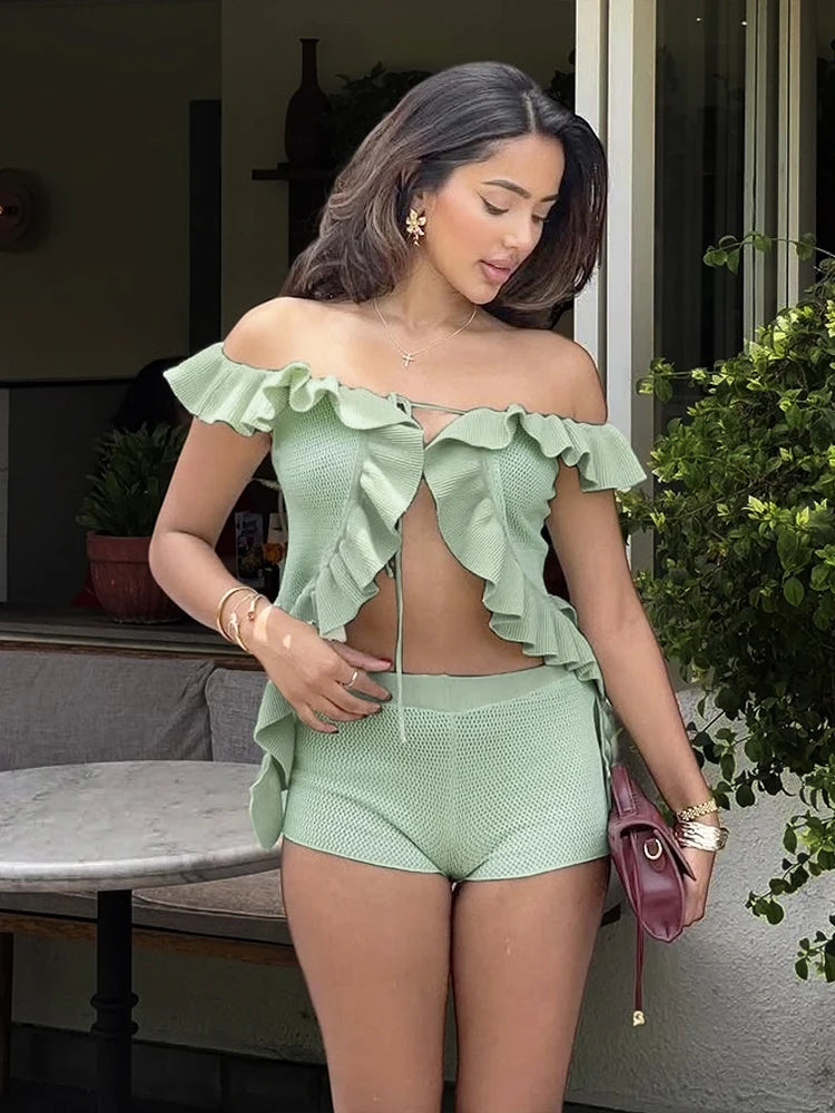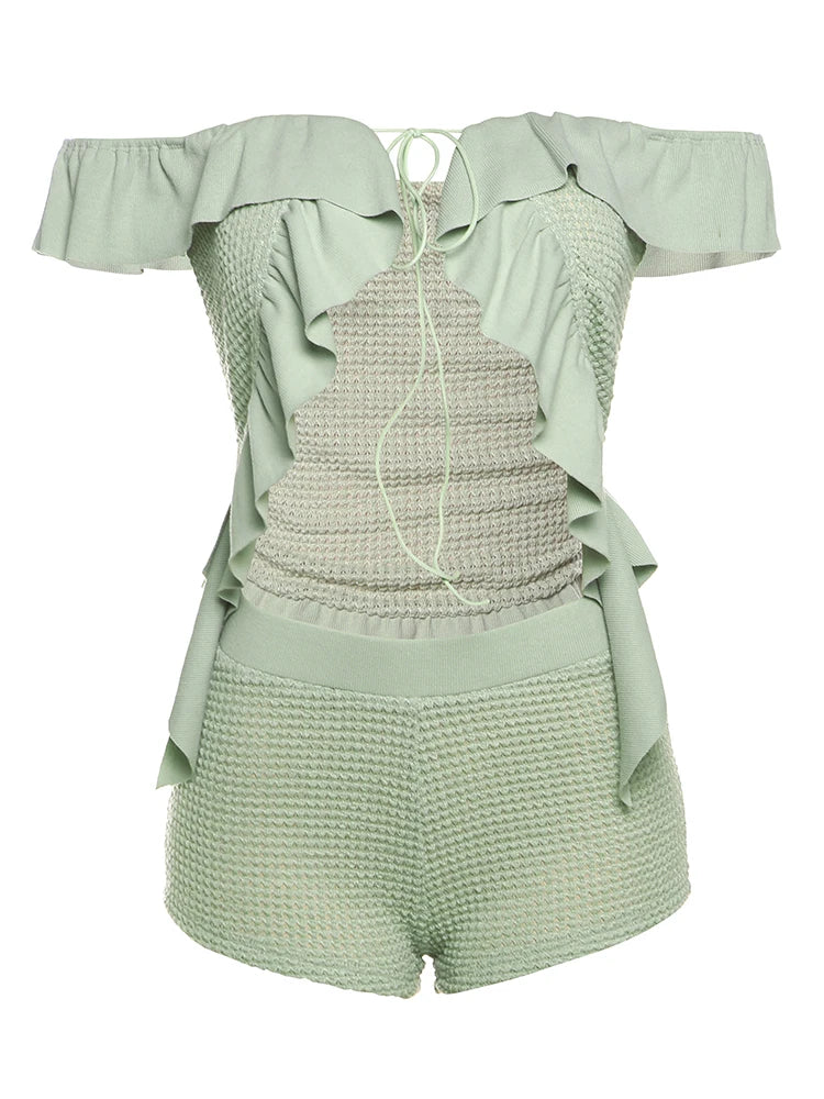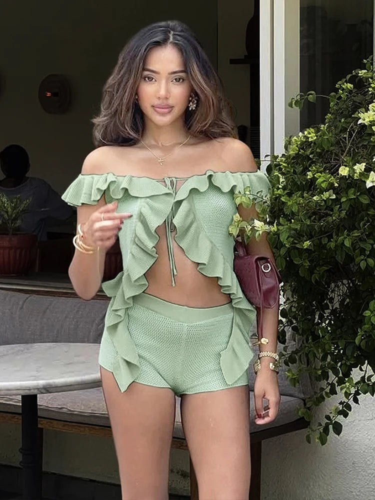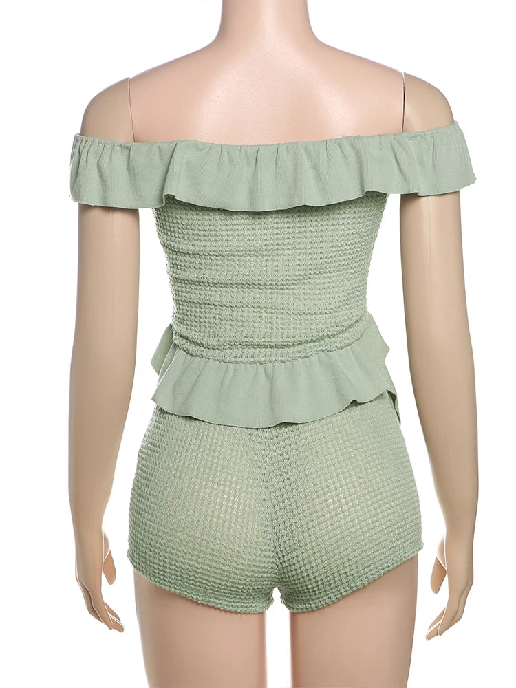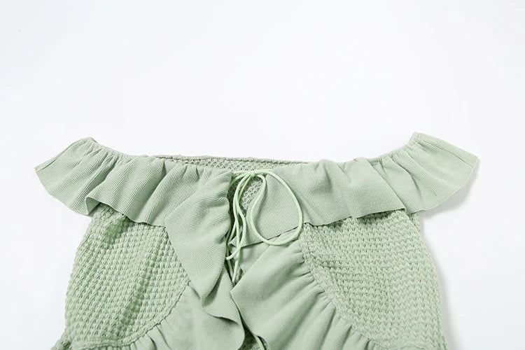 Sweet and playful, this sage green two-piece set is perfect for sunny days and summer nights. The off-shoulder ruffle crop top ties at the front with a flattering ruched design, while the matching textured shorts hug your curves in all the right places.