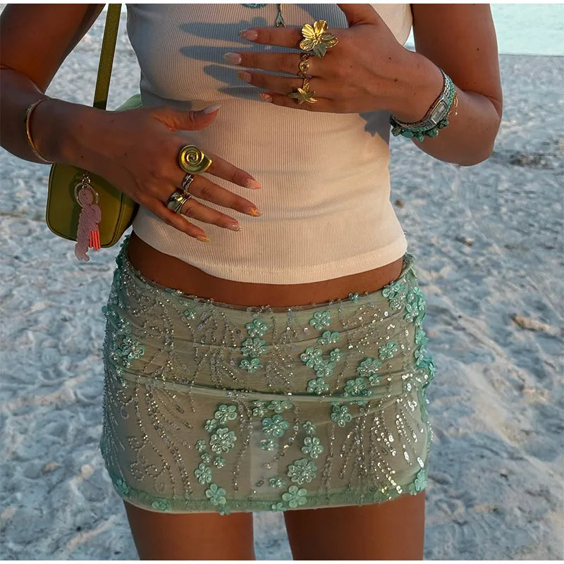 Shine bright with this dreamy embellished mini skirt, designed in a soft seafoam green with floral beading and sequin detailing. The sheer overlay gives it that perfect Y2K-inspired sparkle, while the bodycon fit makes it a must-have statement piece.